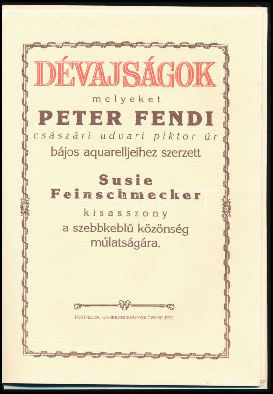 Susie Feinschmecker: Dévajságok, melyeket Peter Fendi császári udvari piktor úr bájos aquarelljeihez szerzett - - kisasszony a szebbkeblű közönség múlatságára. Bp., 1989, Zrínyi Nyomda. Egészoldalas, színes illusztrációkkal. Kiadói kartonált papírkötés, kissé sérült borítóval, néhány lap kijár.