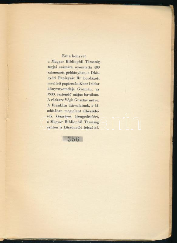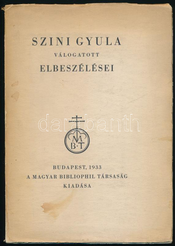 Szini Gyula válogatott elbeszélései. Bp., 1933., Magyar Bibliophil Társaság, 1 (Végh Gusztáv rézkarc) t. +143+5 p. Kiadói papírkötés, kissé foltos borítóval, a gerincen kis szakadással, szétvált kötéssel. Számozott (356./400) példány.
