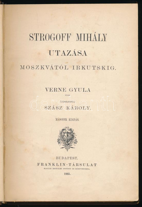 Verne Gyula: Strogoff Mihály utazása Moszkvától Irkutskig. Átdolgozta:... https://www.darabanth.com/hu/462-Gyorsarveres/462.0/Konyvek/Konyvek-Egyeb-ritkasagok~2000016/Verne-Gyula-Strogoff-Mihaly-utazasa-Moszkvatol-Irkutskig-Atdolgozta-Szasz-Karoly-Bp-1885-~II3105118