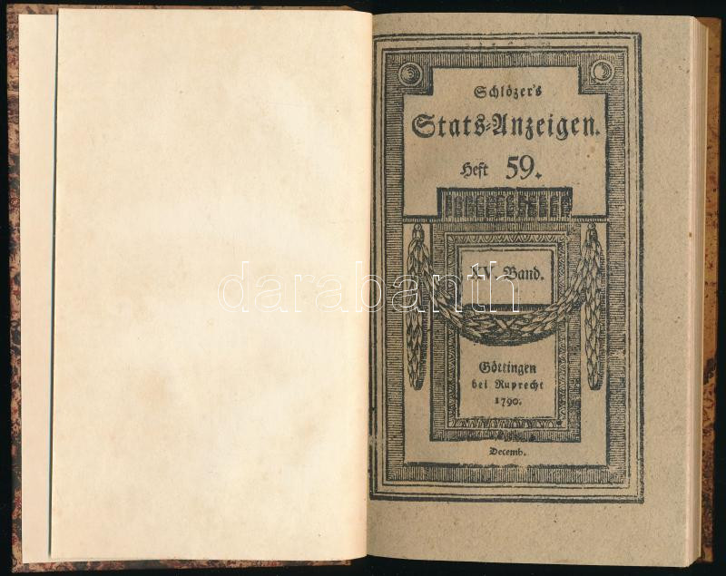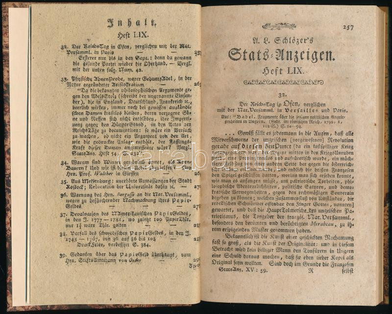Hungarika (Schlözer, August Ludwig). Schlözer's Stats Anzeigen. Heft 59. Göttingen, 1790. Ruprecht. 257-281p. Benne a magyar arisztokrácia híreivel. Jó állapotban Korhű kartonálásban