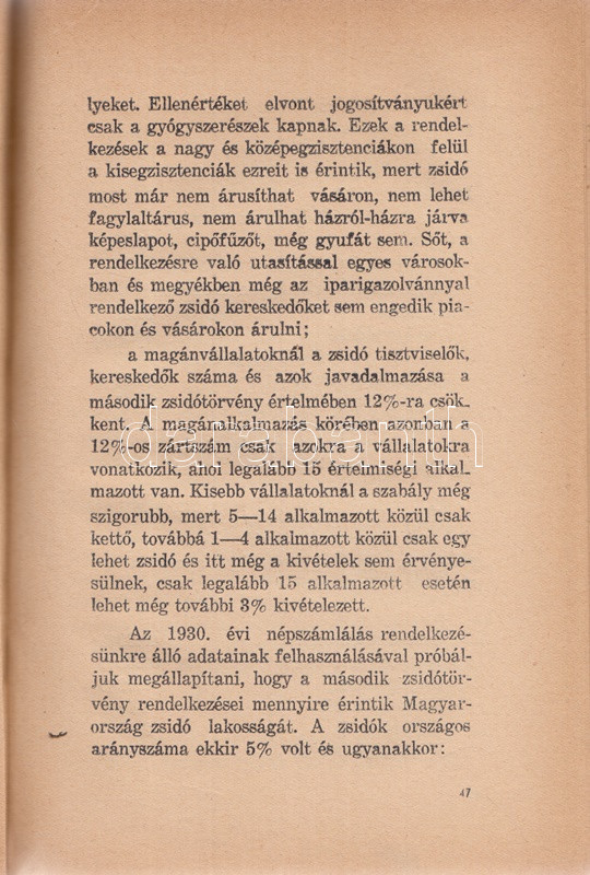 Az első és második zsidótörvény alkalmából kiadott munka áttekinti a jogfosztott zsidóság helyzetét, statisztikai kimutatásokat ismertet, lajstromozza az egyes művészeti ágakban mellőzött kiválóságokat, illetve önsegélyező, karitatív megoldásokat javasol. Az első előzéken régi tulajdonosi bejegyzés.