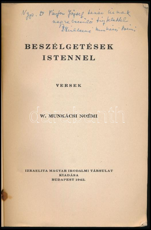 W. Munkácsi Noémi, [Winklerné]. Beszélgetések Istennel. Versek. Budapest, 1942. Izraelita Magyar Irodalmi Társulat (Arany János irodalmi és nyomdai műintézet rt.) 79 + [1] p. DEDIKÁLT!. Fűzve, illusztrált kiadói papírborítóval. Kis sérüléssel a gerincen.