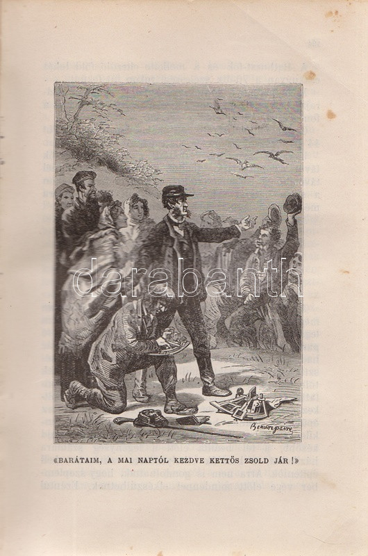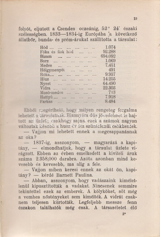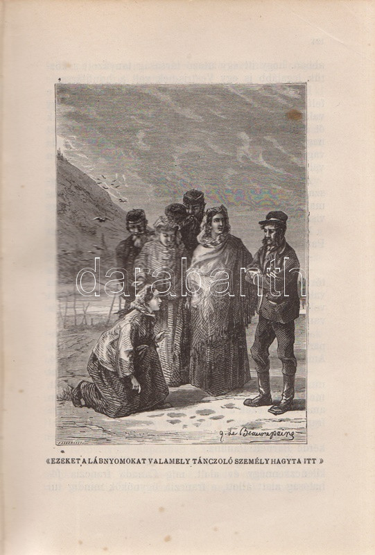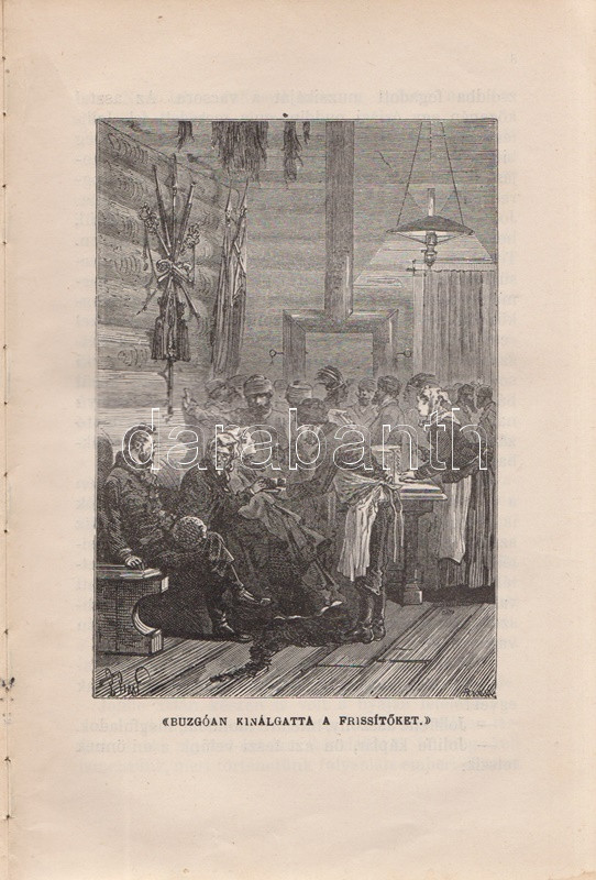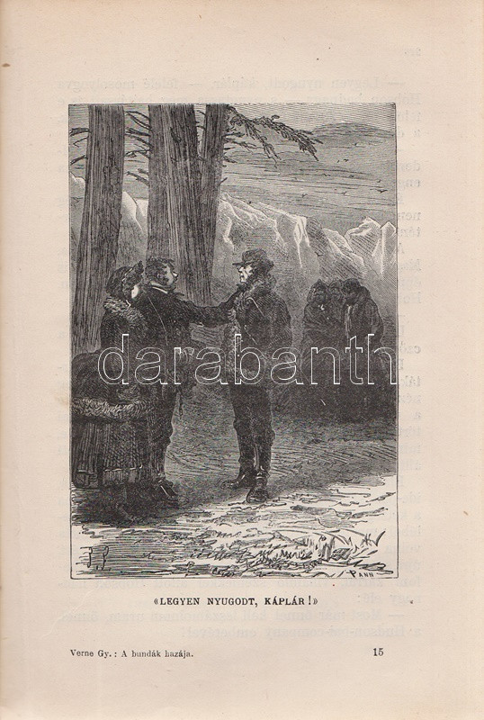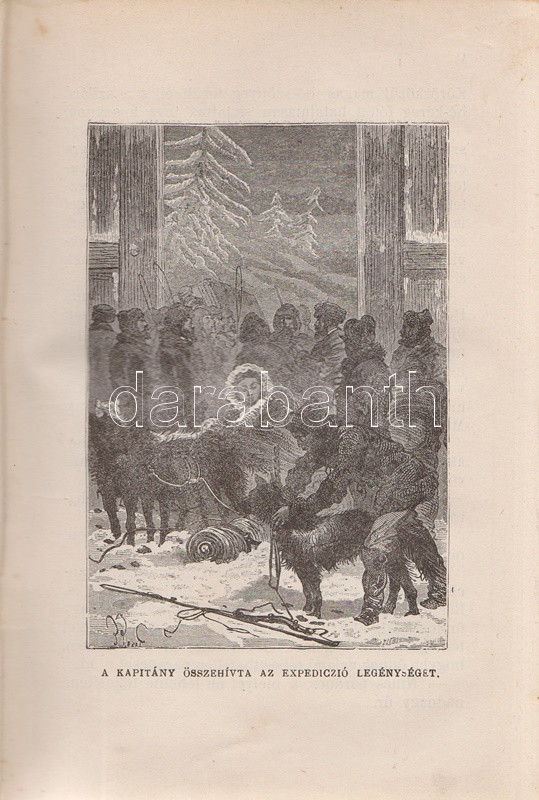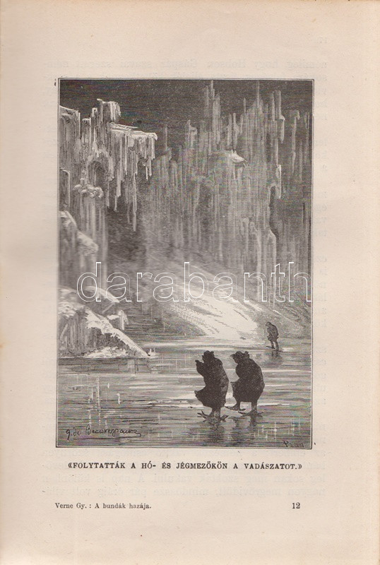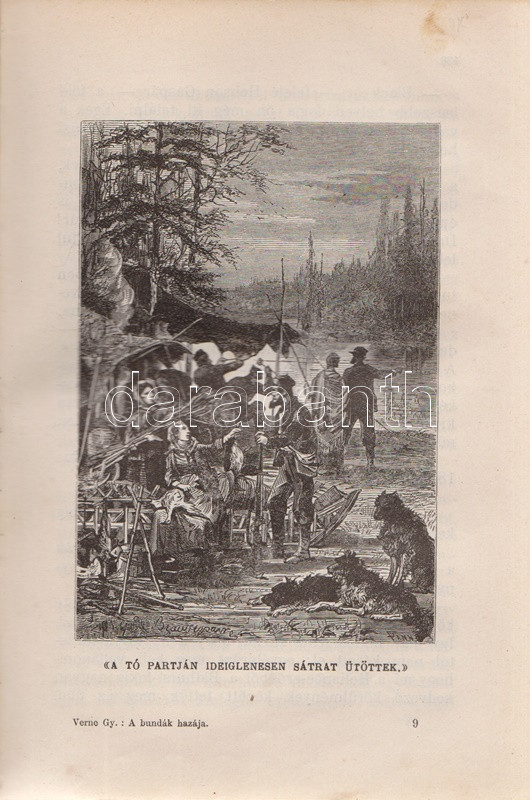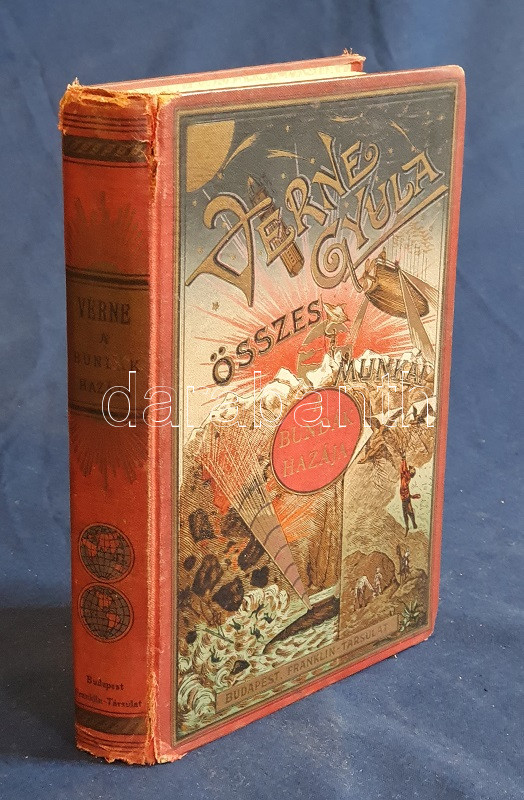 Verne, [Jules] Gyula: A bundák hazája. Regény. Második, egyedül jogosÃtott magyar képes kiadás. FordÃtotta Gaal Mózes. [Teljes.] Budapest, 1910. Franklin-Társulat Magyar Irodalmi Intézet és Könyvnyomda. 386 p. Verne Gyula Hudson-öböl környékén játszódó prémvadászati, csillagászati, eszkimó néprajzi és a szélsÅ‘séges idÅ‘járás jelentette fenyegetést feldolgozó kalandregénye eredeti nyelven elÅ‘ször folyóiratfolytatásokban jelent meg, a ,,Magasin d'éducation et de récréation" hasábjain, 1872-1873-ban, ,,Le Pays des fourrures" cÃmmel. Kötet formájában elÅ‘ször 1873-ban látott napvilágot, magyar nyelven elsÅ‘ként György Aladár átdolgozásában (Ráth Mór, 1876), igazi klasszikus fordÃtása azonban Gaal Mózes 1899-ben jelent meg, a Franklin-Társulat Verne-sorozatában. A Gaal Mózes-féle fordÃtás a századfordulótól Zempléni P. Gyula szövegváltozatával versenyzett (Vass J., 1905), ám a Franklin-Társulat-féle Gaal Mózes-fordÃtás továbbra is az egyedül jogosÃtott képes kiadás maradt, amely közölte a francia eredetihez készÃtett 101 egész oldalas illusztrációt. Néhány oldalon apró, halvány foltosság. Az elsÅ‘ elÅ‘zéken kézÃrásos jegyzet, az illusztrált cÃmoldalon régi tulajdonosi bejegyzés. Aranyozott, festett, vaknyomásos, sérült gerincű kiadói egészvászon kötésben, márványmintás festésű lapszélekkel, a hátsó kötéstábla sarkán apró foltossággal.