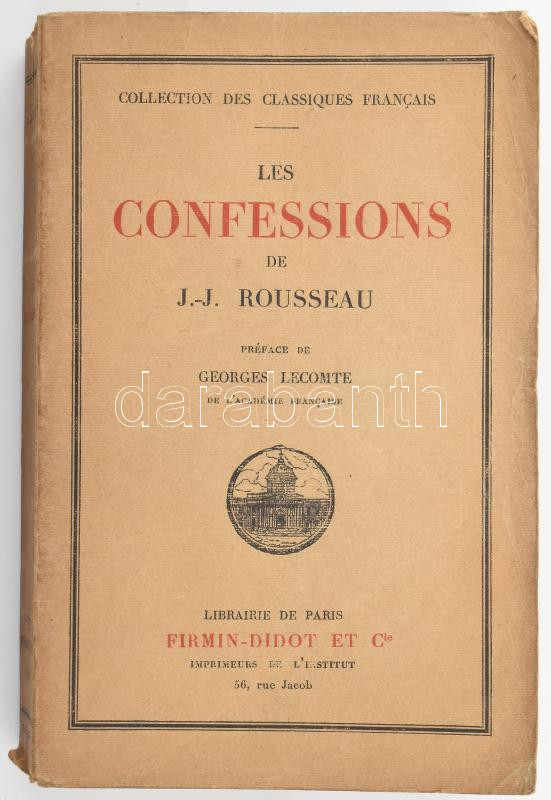 Rousseau,J[ean]-J[acques]: Les Confessions de - - -. [Vallomások.] Préface de Georges Lecomte de L'Académie Francaise. Paris,én.,Firmin-Didot et C. Francia nyelven. Kiadói papírkötés.