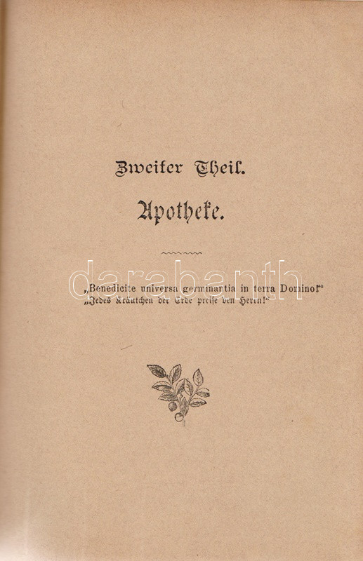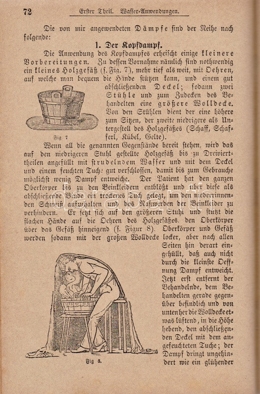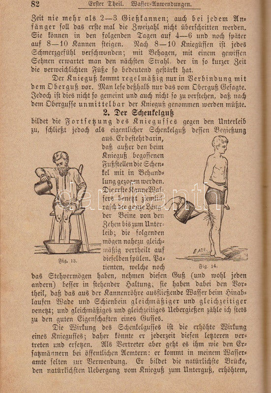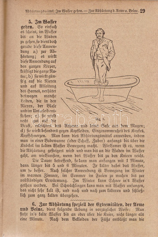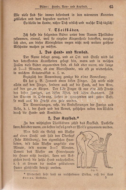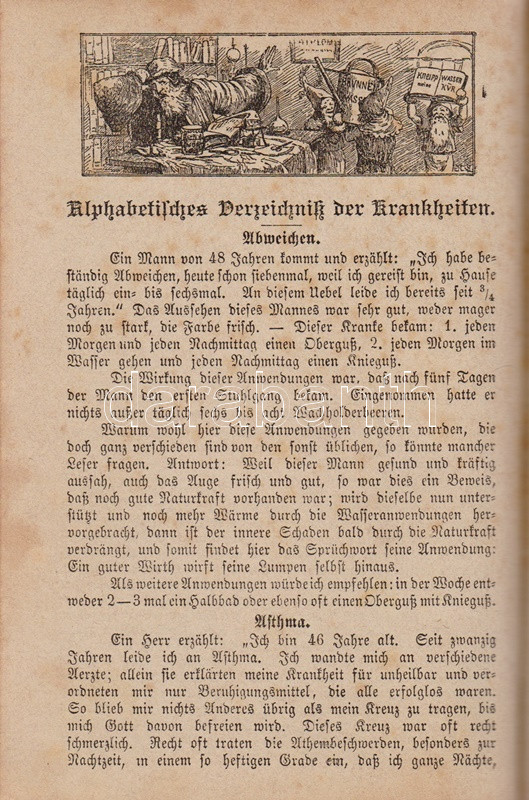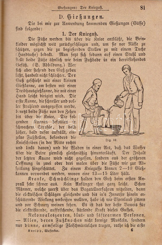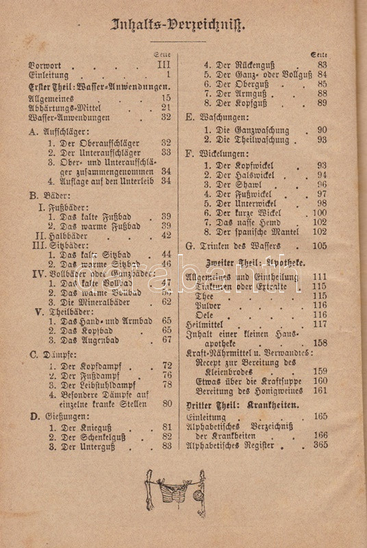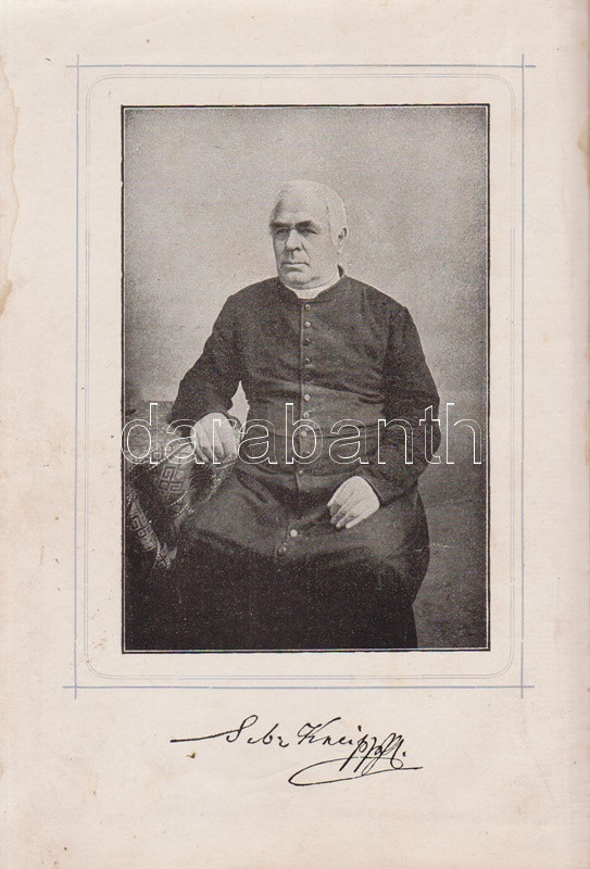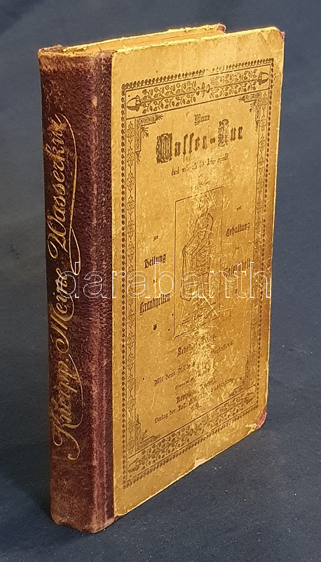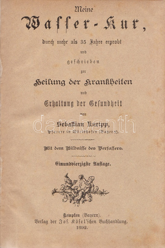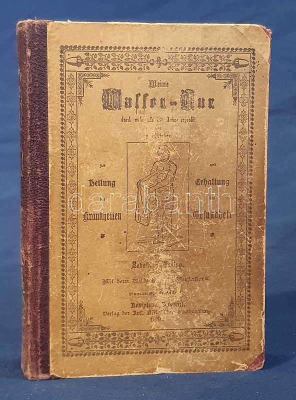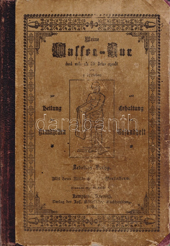 Kneipp, Sebastian: Meine Wasser-Kur, durch mehr als 35 Jahre erprobt und geschreiben zur Heilung der Krankheiten und Erhaltung der Gesundheit. Mit dem Bildnisse der Verfassers. Kempten, 1892. Verlag der Jos. Köfel'schen Buchhandlung (Buchdruckerei der Jos. Köfel'Schen Buchhandlung). 1 t. (címkép) + VII + [1] + 376 + [16] p. Sebastian Kneipp (1821-1897) bajor katolikus pap és természetgyógyász, a mérsékelt táplálkozással és sok mozgással kiegészített természetes gyógymód hirdetője. Szövegközti illusztrációkkal kísért vízgyógyászati munkájában bőséggel tallózhatunk a különféle vízkúrákban, hát-, fej-, térdleöntésekben, gőzölésekben és borogatásokban, fürdőkben és pakolásokban, majd gyógynövényterápiás javaslatai követnek. A munka harmadik része a XIX. század utolsó harmada betegségeinek katalógusa, a betegségek leküzdésére jobbára a természetes gyógyászat eljárásait javasolja. A munka első kiadása 1886-ban jelent meg, példányunk a 41. kiadásból származik. A terapeuta és pap Bad Wörishofen-i kolostora valóságok zarándokhellyé, majd gyógyhellyé vált a századvégen, a számos előkelőséget, többek között koronás főket és a pápát is kúráló Kneipp hírneve egyre csak nőtt a század utolsó évtizedében, a századfordulóra a Kneipp-kúra fogalommá vált, a bajor természetgyógyász pedig világszerte a legismetebb németek egyikévé vált. Aranyozott gerincű, illusztrált, enyhén kopott kiadói félbőr kötésben, márványmintás festésű lapszélekkel. Jó példány.