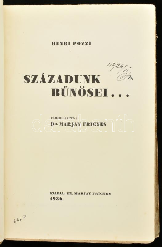 Henri Pozzi: Századunk bűnösei. Ford. Dr. Marjay Frigyes. Bp., 1936, Dr. Marjay Frigyes. Kiadói illusztrált papírkötésben, a gerincen kis sérüléssel. A könyv szerepel az 1945-ben az Ideiglenes Nemzeti Kormány által betiltott fasiszta, és szovjetellenes könyvek listáján.