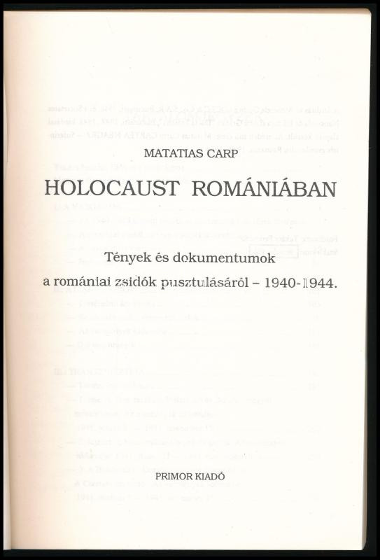 Matatias Carp: Holocaust Romániában. Tények és dokumentumok a romániai zsidók pusztulásáról - 1940-1944. Ford.: Takács Ferenc. H.n., é.n., Primor. Második kiadás. Kiadói papírkötés, a borítón némi kopással.