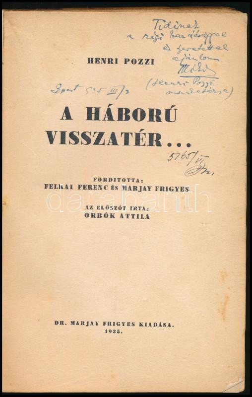 Pozzi, Henri: A háború visszatér. 1935, Dr. Marjay Frigyes Kiadása. Kiadói papírkötés, kissé kopot. A könyv szerepel az 1945-ben az Ideiglenes Nemzeti Kormány által betiltott fasiszta, és szovjetellenes könyvek listáján.
