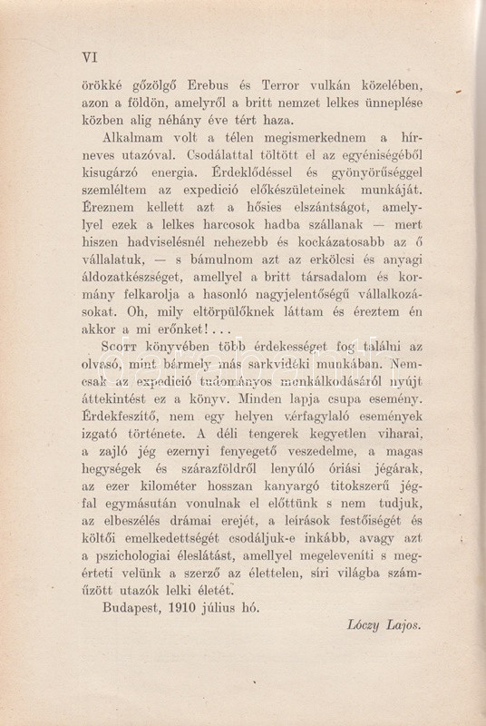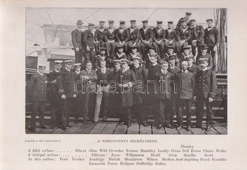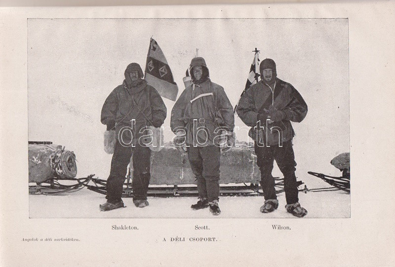 Scott, Robert F[alcon]: Angolok a déli sarkvidéken. Angolból átdolgozta Halász Gyula. 75 képpel, ezek között 47 műmelléklettel és két eredeti felvételek után készült térképpel. Budapest, 1911. Lampel R. - Wodianer F. és Fiai Rt. (Franklin-Társulat ny). 1 t. (címkép) + VI + [2] + 299 + [1] p. + 46 t. (2 kihajtható, 2 dupla oldalas) + 1 térkép (színes, kihajtható). Első magyar kiadás. A délisark-kutatás egyik legnagyobbjának, Robert Scott kapitánynak 1900-1904 között lezajlott expedíciójáról szóló beszámoló, oldalszámozáson belül gazdag szövegközti fotóanyaggal. A századfordulós út során az expedíció, bár számos tudományos megfigyelést végzett, nem tudta elérni a sarkpontot, így vezetője, Scott új legénységével a kötet magyar fordításának kiadása idején, 1910-1912 között ismét megkísérelte elérni a Déli-sarkot, ami sikerült ugyan, de az expedíció életét adta az eredményért. Néhány oldalon apró, halvány foltosság (A Magyar Földrajzi Társaság könyvtára.) Aranyozott, festett gerincű, illusztrált kiadói félvászon kötésben, az első kötéstáblán színes, kőnyomatú illusztrációval, a lapszéleken apró, halvány foltosság.