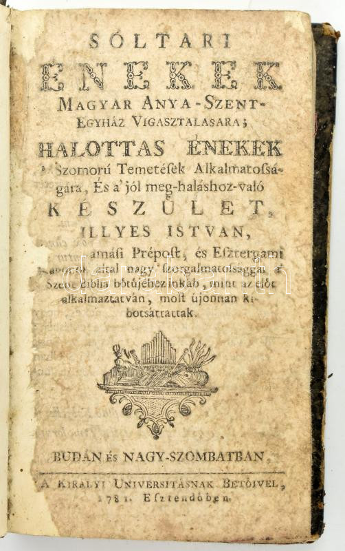 Illyés István: Soltari énekek magyar anya-szentegyház vigasztalására; halottas énekek a szomorú temetések alkalmatosságára, és a' jól meg-haláshoz való készület [...] Buda-Nagyszombat, 1781, Királyi Universitás-ny. Korabeli félbőr-kötésben, kissé viseltes állapotban, az előzéklapon tulajdonosi bejegyzéssel (,,Varga Istvány Illés Zsóltár Énekes Könyve [...] 1856-dik Esztendőben Szexárdon"), a könyv végén több oldalnyi kézzel írt kiegészítéssel. A könyvből egy lap hiányzik (385. oldal)