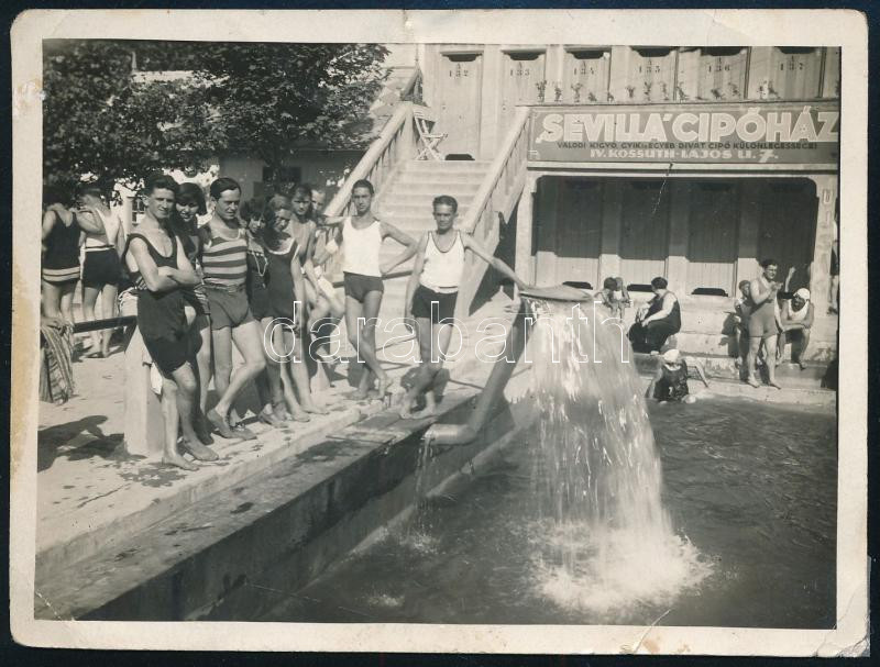 Leírás: 1928 Budapest, csillaghegyi strand reklámmal, fotó, 9×12 cm