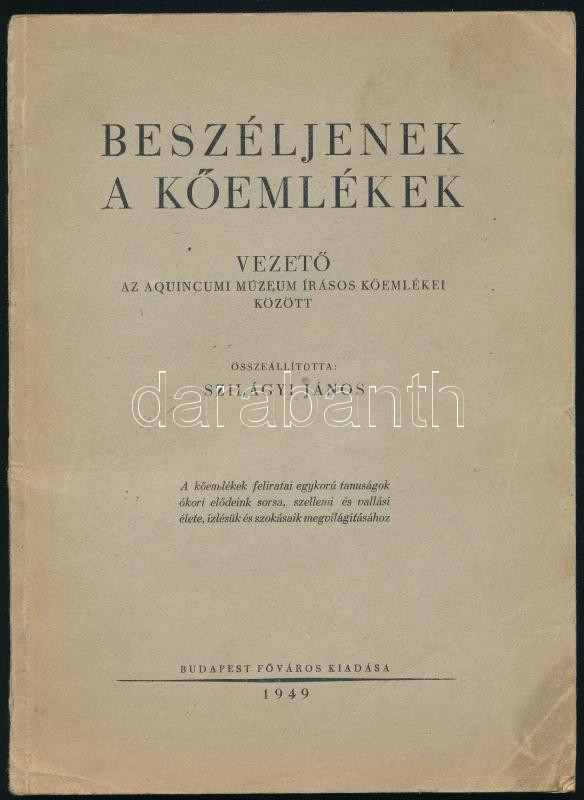 Szilágyi János: Beszéljenek a kőemlékek. Vezető az Aquincumi Múzeum írásos kőemlékei között. Összeáll.: - - . Bp., 1949, Budapest Főváros kiadása, 96 p. Kiadói tűzött papírkötés, a borítón kis szakadással.