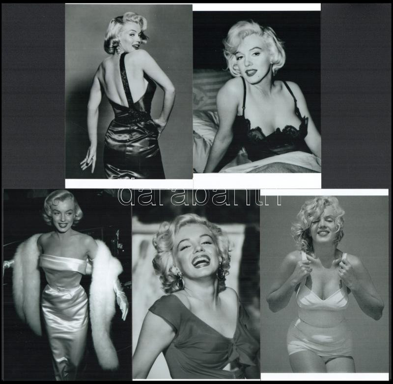 Marilyn Monroe (korábban Norma Jeane) (1926-1962) amerikai színésznő, fotómodell, énekes, eltérő időben készült felvételek, 5 db modern nagyítás Pánczél György (1920-?) filmtörténész hagyatékából és gyűjteményéből, 15x10 cm