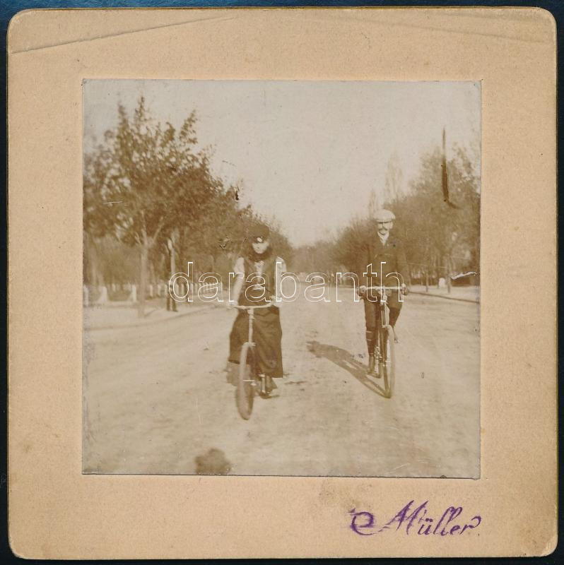Leírás: cca 1905 Biciklizők, keményhátú fotó Müller műterméből, 8×8 cm