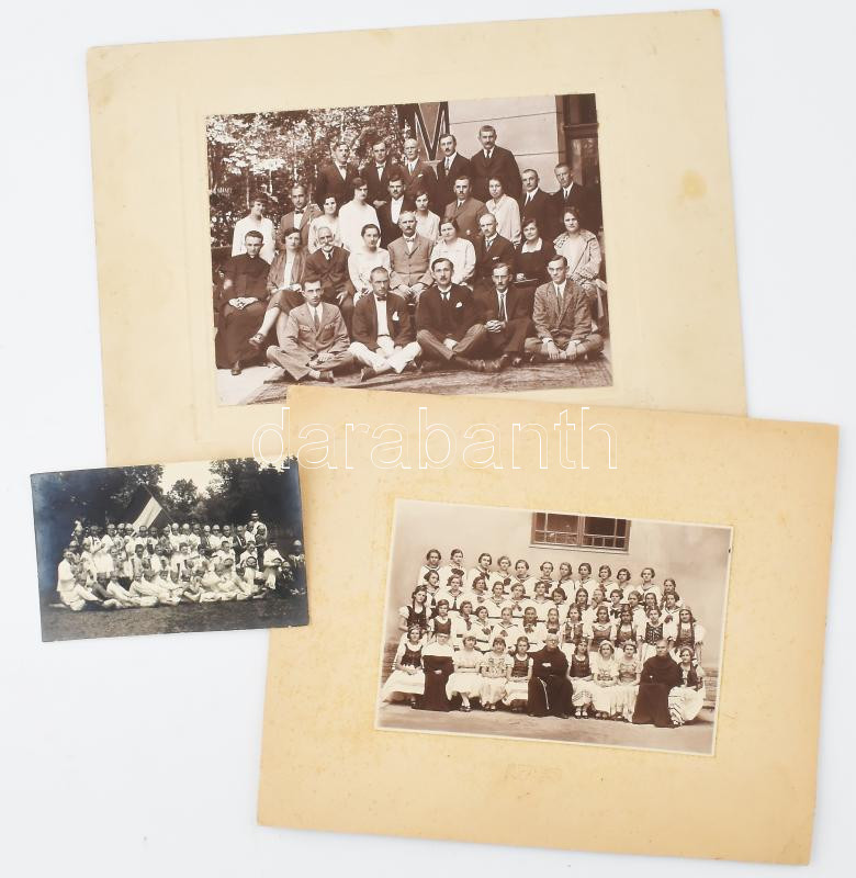 cca 1930-1940 Szeged, 3 db csoportkép / tablófotó (részben a Szeged-alsóvárosi templomhoz köthető), az egyik a hátoldalon részletesen feliratozva a képen szereplők neveivel. 13,5x8,5 cm és 20x15 cm között