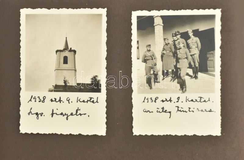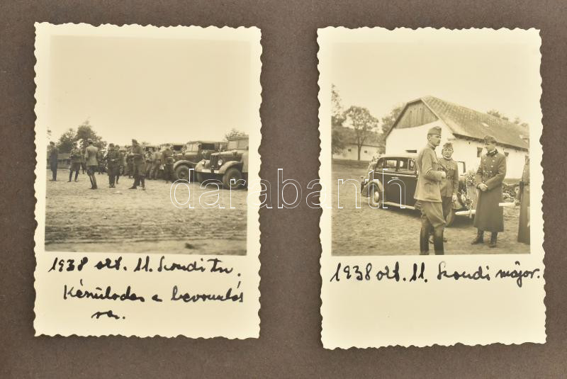 1938 Fotóalbum kis részben falusi életképekkel, többségében katonai fotókkal, Kartal, katonák az Ipolyságra való bevonulás előtt, Ipolyság, Bernecebaráti, Sátoraljaújhely, Ungvár, stb., feliratozott fotók albumba ragasztva, 68 db, többségében 8,5×6 cm