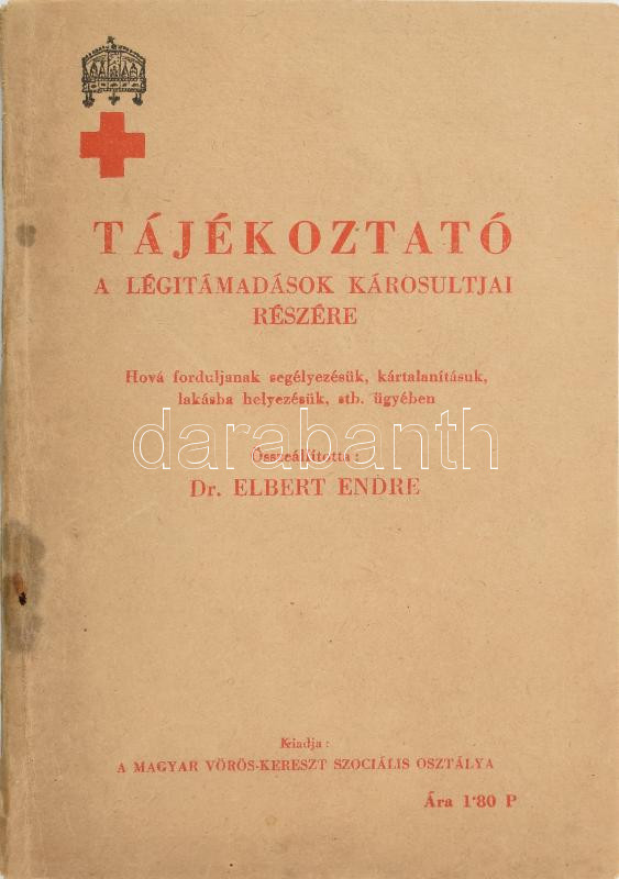 Leírás: 1944 Tájékoztató a légitámadások károsultjai részére. Összeállította: Elbert Endre. Bp., 1944, Magyar Vörös-Kereszt. Kiadói papírkötés, tűzésnél kissé foltos, kissé laza kötéssel.