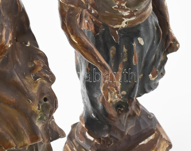 Leírás: 2 darab apostol szobor. cca 18-19.sz., faragott fa, festett blondelmassza. Sérült, hiányos, m: 29-30 cm