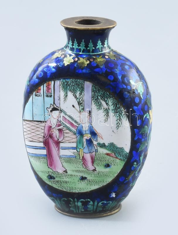Leírás: Antik kínai illatszeres flaska. Réz, zománc festéssel, sérült, hiányos zománc 7 cm