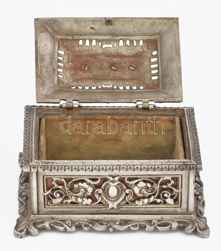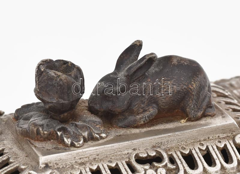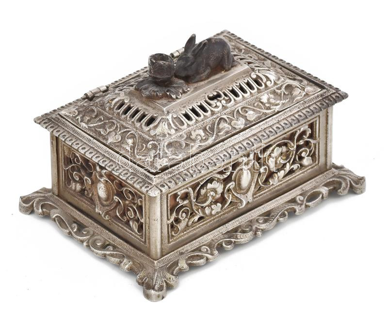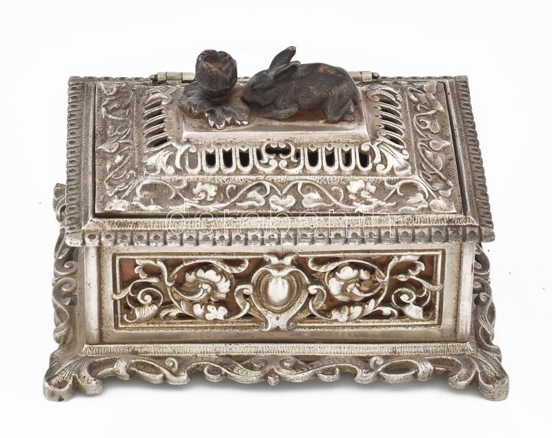 Ékszeres doboz áttört fém nyúl figurával a tetején. 12x17x11 cm https://www.darabanth.com/hu/462-Gyorsarveres/462.0/Mutargy-papirregiseg-egyeb/Mutargyak-antikvitas~500008/Ekszeres-doboz-attort-fem-nyul-figuraval-a-tetejen-12x17x11-cm~II3097990