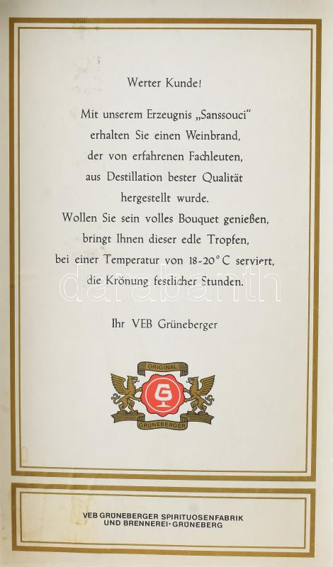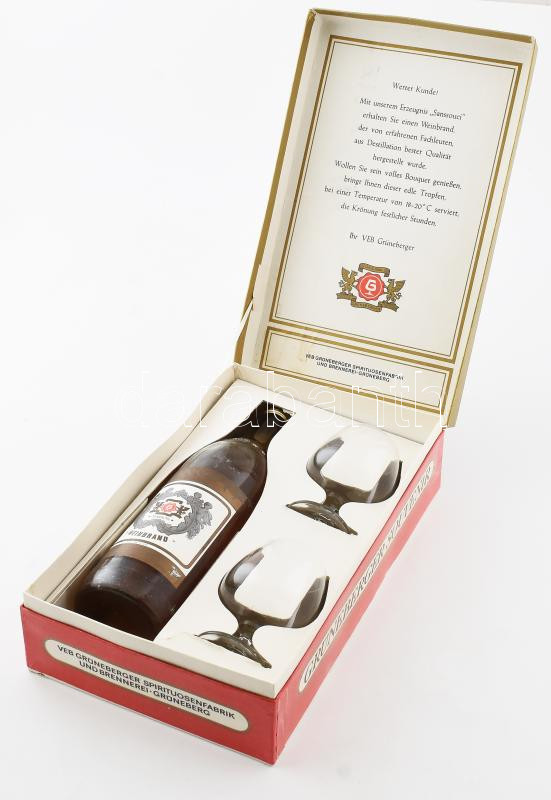Sanssoucci Weinbrand likőr. 38%, bontatlan, 2 pohárral, díszdobozban. https://www.darabanth.com/hu/462-Gyorsarveres/462.0/Mutargy-papirregiseg-egyeb/Muzealis-borok-italok~500017/Sanssoucci-Weinbrand-likor-38-bontatlan-2-poharral-diszdobozban~II3103577