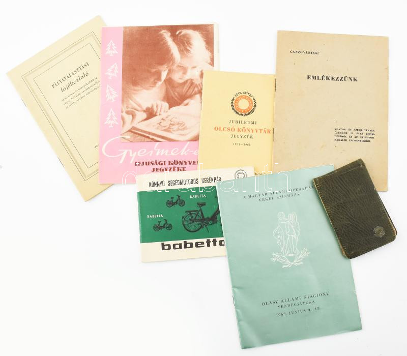 Leírás: cca 1970 babetta moped leírás , füzet + 1916-os naptárfüzet, 2 könyvtári jegyzék, Erkel színház műsorfüzet, Ganz Gyárak emlékezzünk füzet