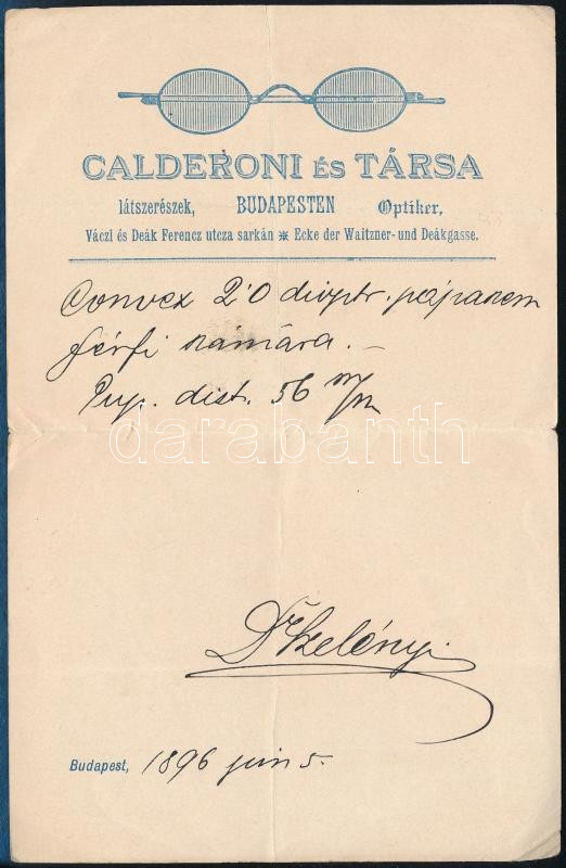 1896 Bp., Calderoni és Társa látszerészek fejléces szemüveg recept https://www.darabanth.com/hu/462-Gyorsarveres/462.0/Mutargy-papirregiseg-egyeb/Okmanyok~500020/1896-Bp-Calderoni-es-Tarsa-latszereszek-fejleces-szemuveg-recept~II3074368