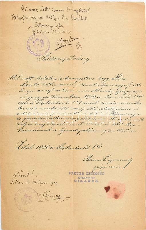 1920 Erdélyi, zilahi gyógyszerész által kiadott bizonyítvány, pecséttel, magyar nyelven, további román nyelvű bélyegzőkkel és feliratokkal, hiányzó viaszpecséttel.