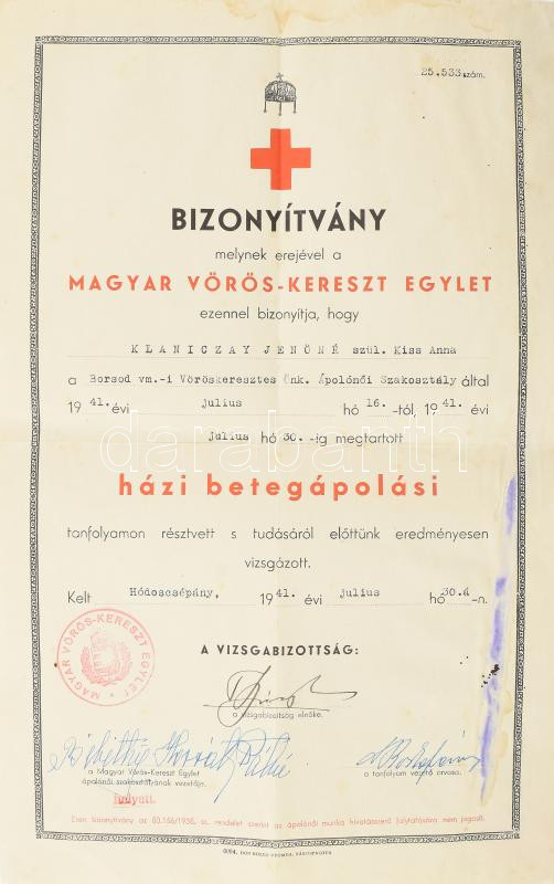 1941 Hódoscsépány, Magyar Vörös-Kereszt Egylet házi betegápolási bizon... https://www.darabanth.com/hu/462-Gyorsarveres/462.0/Mutargy-papirregiseg-egyeb/Okmanyok~500020/1941-Hodoscsepany-Magyar-Voros-Kereszt-Egylet-hazi-betegapolasi-bizonyitvanya-alairasokkal-~II3111949