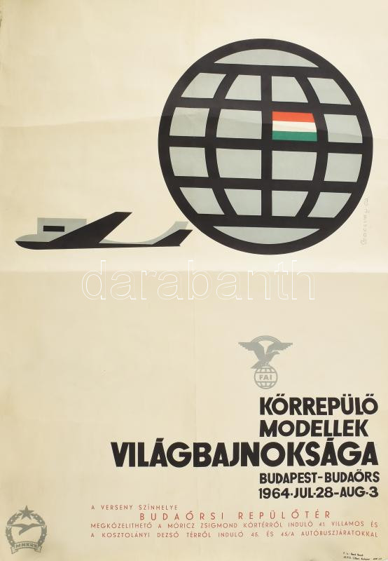 1964 Körrepülő modellek világbajnoksága Budapest - Budaörs 1964 júl. 28. - aug. 3., plakát, jelzett a nyomaton (Szacsvay 64), hajtott, feltekerve, minimális gyűrődéssel és apró szakadásokkal a szélén, 79x56 cm