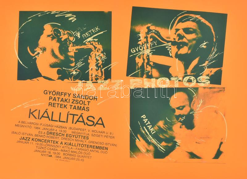 Győrffy Sándor (1951-): Jazz photos, Győrffy Sándor, Pataki Zsolt, Retek Tamás kiállítása, a Belvárosi Ifjúsági Házban (Bp.), 1984. Megnyitja Szigeti Péter és a Dresch Együttes. Plakát, szitanyomat, papír, Győrffy Sándor által ceruzával jelzett ás datált, számozott: 41/80, 50x68 cm. Ritka plakát, a kiállításon jazz koncerteken készült fotók szerepeltek, a plakáton Jan Garbarek, Tomasz Stanko és Anthony Braxton zenészek látható! Lapszéli apró szakadással.