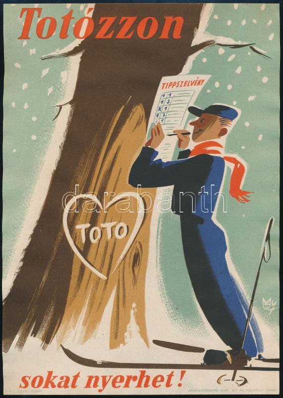 cca 1960 Totózzon - sokat nyerhet, szocreál plakát, szign. Macskássy J... https://www.darabanth.com/hu/462-Gyorsarveres/462.0/Mutargy-papirregiseg-egyeb/Plakat~2000014/cca-1960-Totozzon-sokat-nyerhet-szocreal-plakat-szign-Macskassy-Janos-1910-1993-jo~II3108469