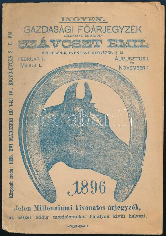 Leírás: 1896 Ingyen gazdasági főárjegyzék - Szávoszt Emil. négyrét hajtott 2 oldalas reklám nyomtatvány lyukkal