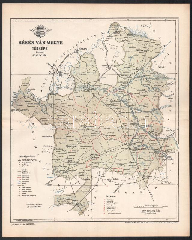 Leírás: 1896 Békés vármegye térképe, tervezte: Gönczy Pál, 1 : 380.000, Bp., Posner Károly Lajos és Fia, a Pallas Nagy Lexikona melléklete, 29,5x23,5 cm