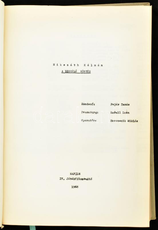 A beszélő köntös. Forgatókönyv, 1968. Rendező: Fejér Tamás. Mafilm. https://www.darabanth.com/hu/462-Gyorsarveres/462.0/Mutargy-papirregiseg-egyeb/Tortenelmi-dokumentumok-keziratok-erdekessegek~500021/A-beszelo-kontos-Forgatokonyv-1968-Rendezo-Fejer-Tamas-Mafilm~II3101625