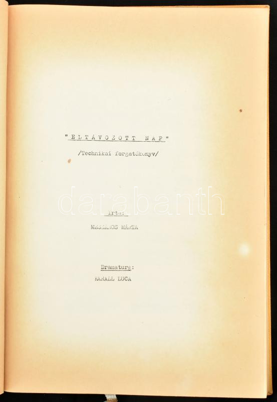 Eltávozott nap. Technikai forgatókönyv. Írta: Mészáros Márta. Dramatur... https://www.darabanth.com/hu/462-Gyorsarveres/462.0/Mutargy-papirregiseg-egyeb/Tortenelmi-dokumentumok-keziratok-erdekessegek~500021/Eltavozott-nap-Technikai-forgatokonyv-Irta-Meszaros-Marta-Dramaturg-Karall-Luca-Mafilm~II3101609