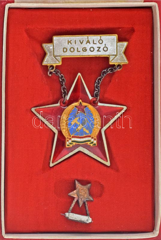 Leírás: 1955. "Kiváló Dolgozó" Rákosi-címeres zománcozott kitüntetés, miniatűrrel, Rákosi-címeres tokban, igazolvánnyal T:XF