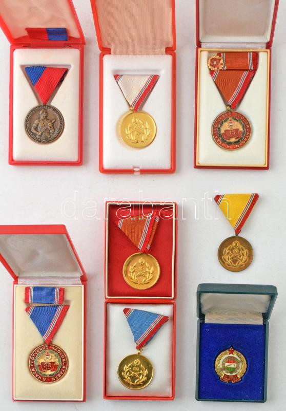 8db-os szocialista kitüntetés-tétel, benne "Kiváló Munkásőr" aranyozott, műgyantás kitüntető jelvény eredeti tokban + 1983. "Honvédelmi Érdemérem" 10, 15, 20 és 25 év után aranyozott bronz kitüntetés eredeti mellszalagon (4xklf) + 1965. "Szolgálati Érdemérem - A Haza Fegyveres Szolgálatában 15 és 20 év után" zománcozott kitüntetés eredeti mellszalagon, eredeti de sérült tokban (2xklf) + 1964. "Munkásőr Emlékérem" bronz kitüntetés mellszalagon, szalagsávval, tokban T:UNC-XF