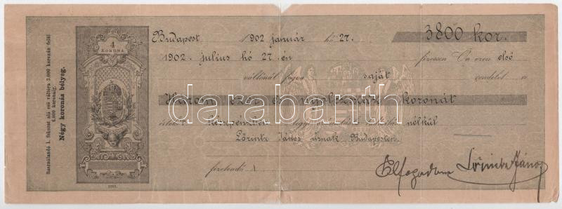 Leírás: Budapest 1902. Kitöltött váltó 3800K-ról, vízjeles papíron T:F ragasztva