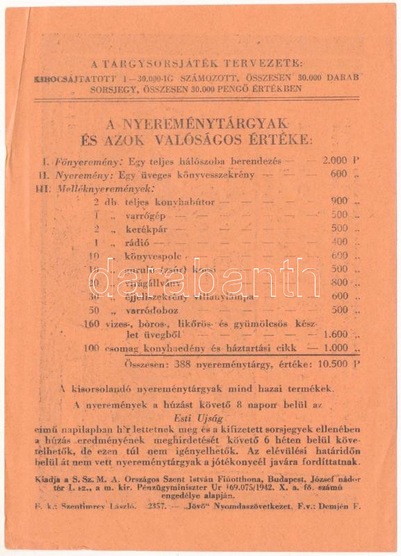 1942. "Sokgyermekes Szegény Magyar Anyák Országos "Szent István" Fiúotthona" tárgysorsjáték sorsjegy a jövő nemzedékért, 1P értékben, "27217" sorszámmal, bélyegzéssel T:XF hajtatlan, de nagyobb sarokhajlások
