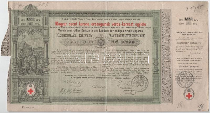 Leírás: Budapest 1882. "Magyar szent korona országainak vörös-kereszt egylete" kisorsolási kötvénye 5Ft értékben bélyegzésekkel T:F