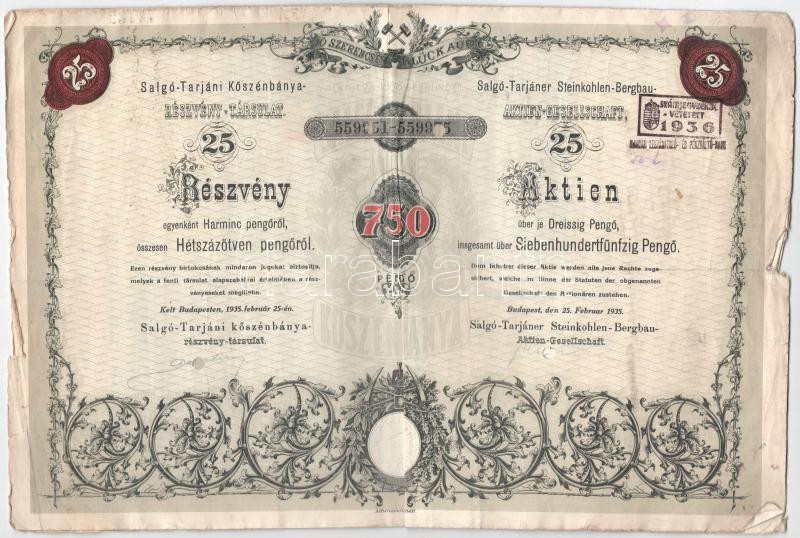 Budapest 1935. "Salgó-Tarjáni Kőszénbánya Részvény-Társulat" 25db részvénye egyben összesen 750P-ről, magyar-német kétnyelvű részvény, szelvényekkel, szárazpecséttel és bélyegzésekkel, lyukasztásokkal érvénytelenítve T:F