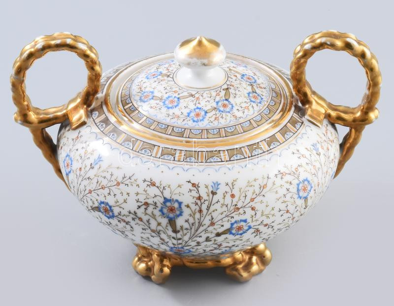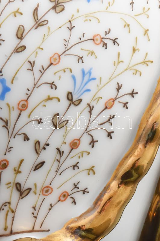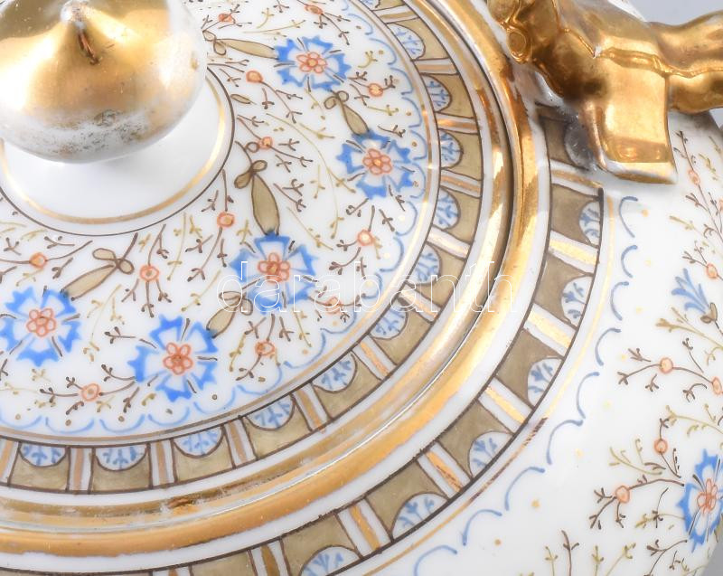 Leírás: Antik porcelán bonbonier. Jelzés nélkül, aprólékos kézi festéssel, fülei kötélhuzalt imitálnak. Kopással, 13x19 cm