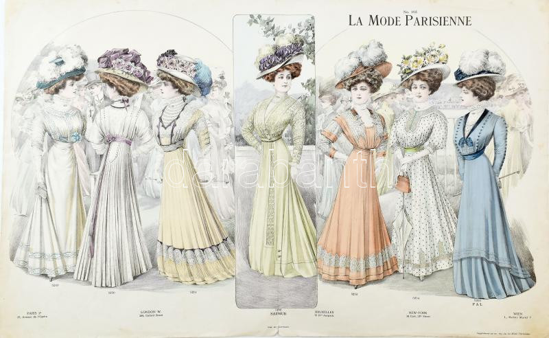 cca 1905 Hölgyek divatos ruhába és kalapban, litográfia, papír. La Mode Parisienne No. 105 lapszámának melléklete; apró szakadásokkal, lapméret: 41x60 cm