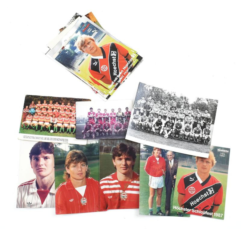 cca 1980 Vegyes foci fotó tétel, közte Détári Lajosról, benne nyomatok és fotók vegyesen, ismétlődésekkel, különféle méretben, változó állapotban, kb. 25 db.