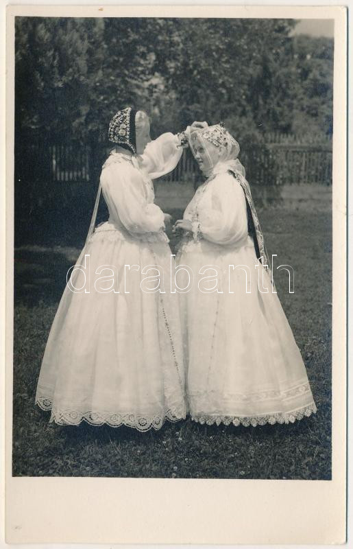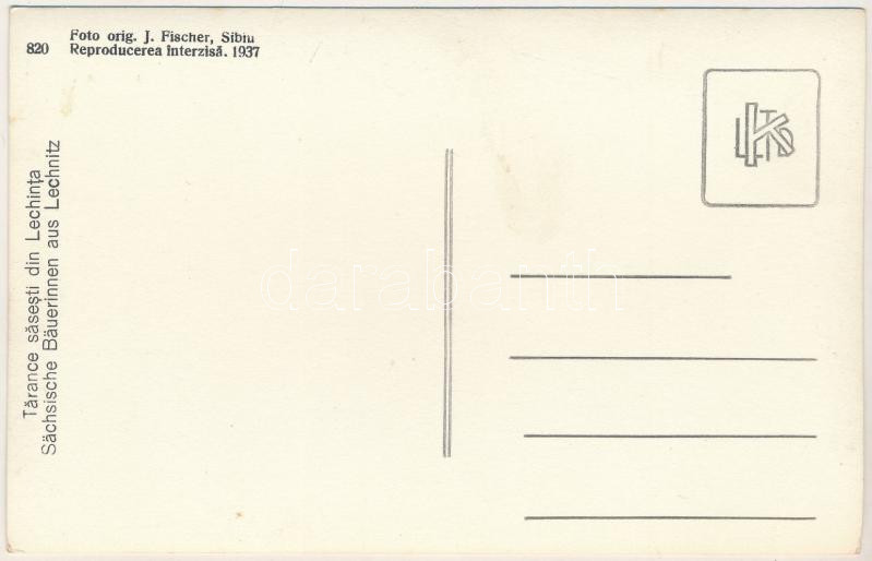 Leírás: Szászlekence, Lekence, Lechnita, Lechnitz; Tarance sasesti / Sächsische Bäuerinnen / Erdélyi szász népviselet, folklór / Transylvanian Saxon folklore. Foto orig. J. Fischer, 1937.