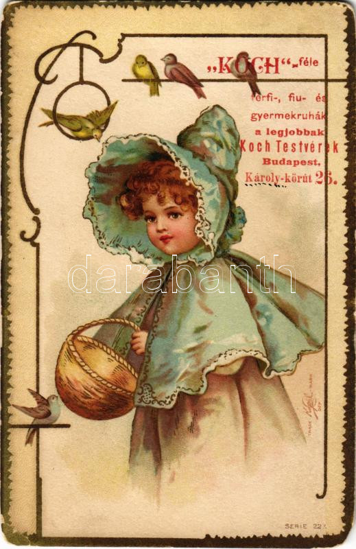Koch Testvérek férfi-, fiú- és gyermekruhák a legjobbak. Budapest, Károly körút 26. Szecessziós zsidó üzlet reklámj, litho. Kopal Serie 227. / Hungarian Jewish shop advertisement (EM)