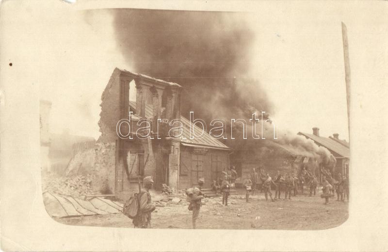 Leírás: 1915 Brest-Litovsk (Belarus); az égő város katonákkal / WWI military, the city is burning down, soldiers. photo (tear)