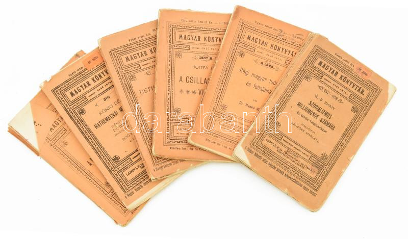 6 db Magyar Könyvtár füzet: Balogh Pál: A magyar faj uralma, Kőnig Dénes: Mathematikai mulatságok, Angyal Dávid: Bethlen Gábor életrajza, Hoitsy Pál: Csillagok világából, Hankó Vilmos. Régi magyar tudósok és feltalálók, Benedek Marcell: Szocialismus milliomosok számára és egyéb tanulmányok. Bp., ca 1890 Lampel. Kiadói, vegyes állapotú papírkötésekben