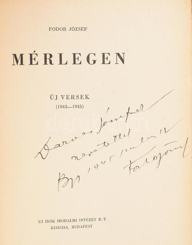 Fodor József: Mérlegen. Új versek (1943-1945.) Fodor József összes versei (1922-1942.) A szerző, Fodor József (1898-1973) költő, író, újságíró, műfordító által Darvas József (1912-1973) Kossuth-díjas író, politikus részére DEDIKÁLT példány. Bp., 1945., Uj Idők. Első kiadás. Kiadói papírkötés, kissé szakadt borítóval.